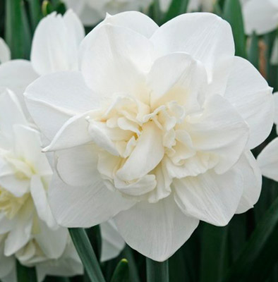 Махровые сорта просто поражают воображение разнообразием форм и расцветок. У представленного на фото экземпляра тоже необычный вид. В высоту многолетник достигает 35 – 40 см. Это популярный срезочный сорт. Период цветения начинается в апреле и длится весь май. Цветки белоснежные, крупные. В центре размещена розетка, состоящая из мелких долей коронки. Нарцисс источает сильный аромат.