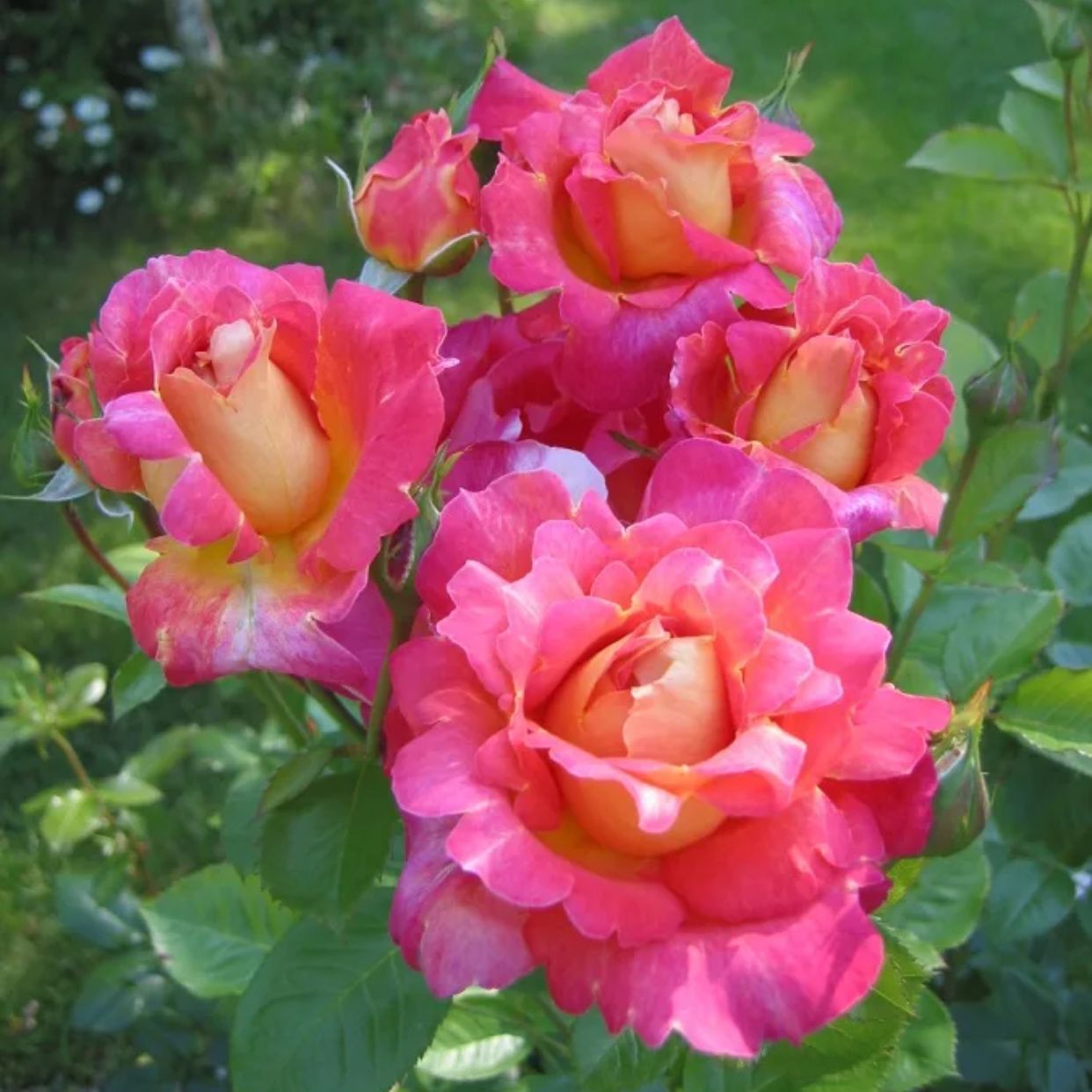 Кусты вырастают от 1,2 до 1,7 м в высоту. Они густые, с крепкими вертикальными побегами. Листья крупные, темно-зеленые, с гладкой поверхностью. На каждом стебле формируются пышные соцветия из 1 – 3 бутонов. При правильной агротехнике можно добиться и более обильного цветения. Бутоны не слишком крупные, округло-яйцевидной формы. Со временем они раскрываются в полумахровые (17 — 25 лепестков) цветки, диаметром 9 — 10 см. Окраска лепестков неравномерная. Те из них, что отгибаются наружу малиново-розовые. Внешняя их сторона бледно-желтая. В стадии полного роспуска цветок имеет чашевидную форму. Цветение обильное и продолжительное, с июня и до самых заморозков. Аромат приятный и ненавязчивый.
